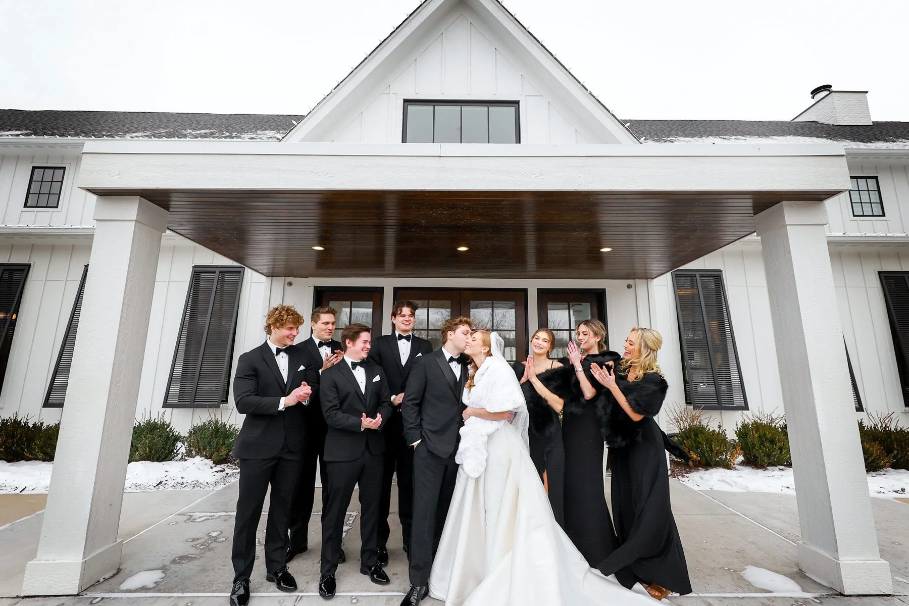 Fresh snow covered the ground as a light dusting fell around us. Allison put on a shawl to stay warm as they danced under the low hanging lights and snowflakes lazily fell around them. Back inside, the room was warm and inviting. More gorgeous flower arrangements decorated the tables and the candles were lit with care. After a few sweet toasts, they took to the dance floor with an incredible band playing their song. They twirled across the floor and were soon joined by their parents. Adam set his jacket aside while Allison made a quick change into her party dress that was made for dancing. The band played hit after hit and I even ran back into the room a few times to see which song they were playing because I didn’t want to miss a single one. Champagne flowed and the dance floor filled with happy partygoers showing off their moves. Before the night came to a close, we set up a sparkler send off but whoever was brave enough to withstand the cold temperatures. With sparklers held high, the crowd cheered on the happy newlyweds.
