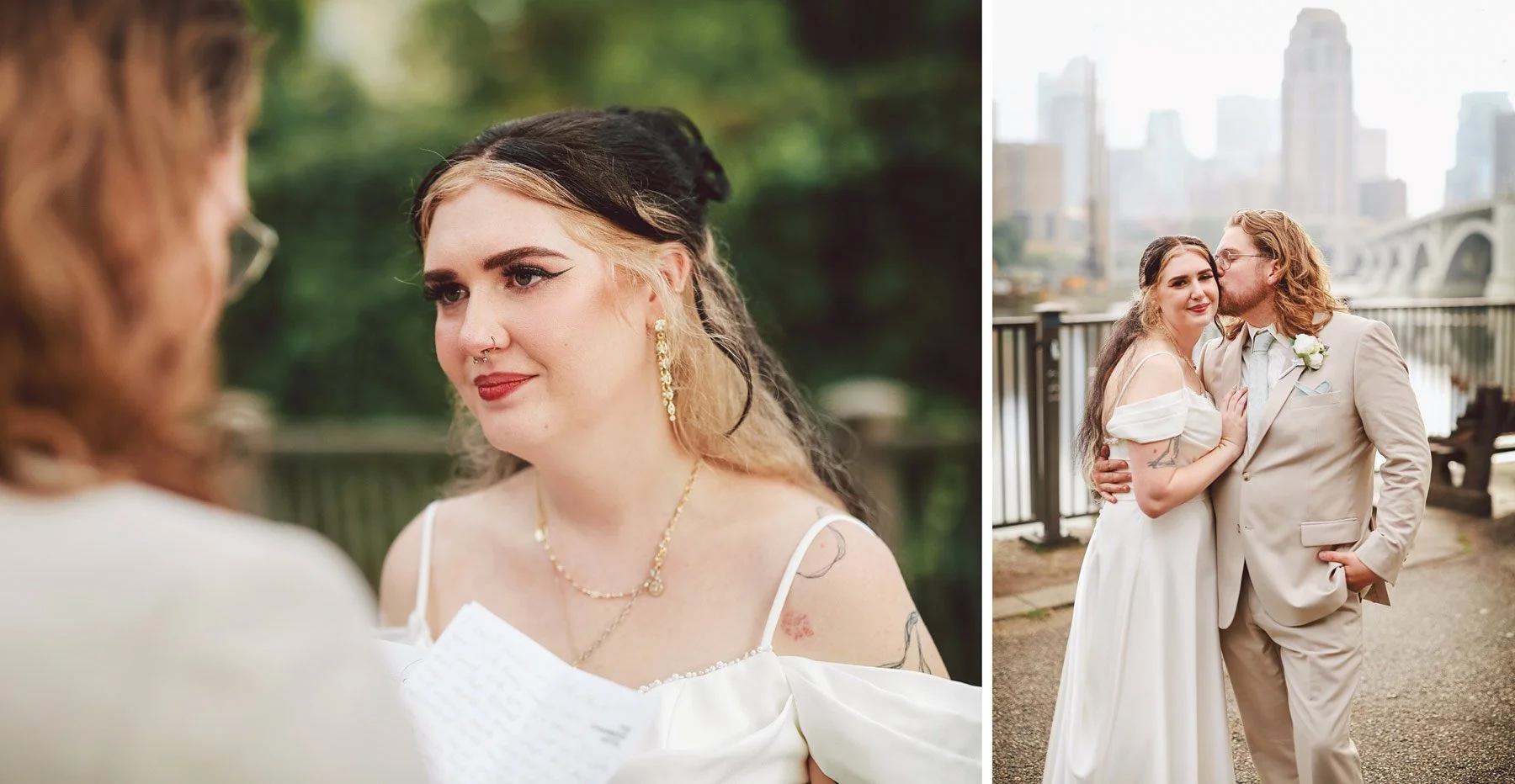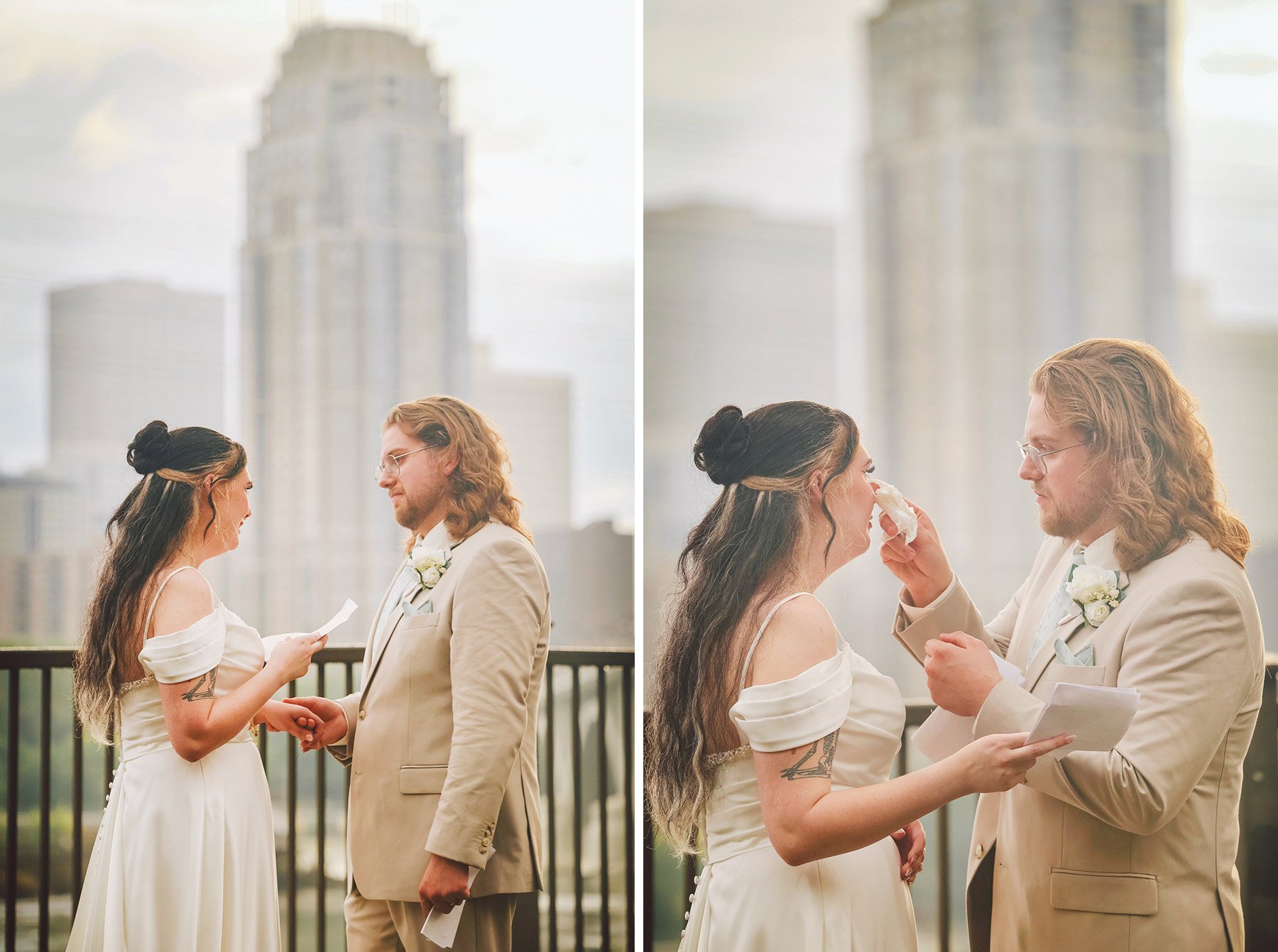 Afterward we spent a little time together along the riverfront taking in the soft light and the beautiful mist hanging over the water. They shared a quiet exchange of letters with one another. Reading each other’s words privately created this beautiful pause in the middle of the excitement of the day. Outside along the river, a gentle mist had settled over the city. The fog hung thick over the water, creating this dreamy atmosphere that felt almost cinematic.