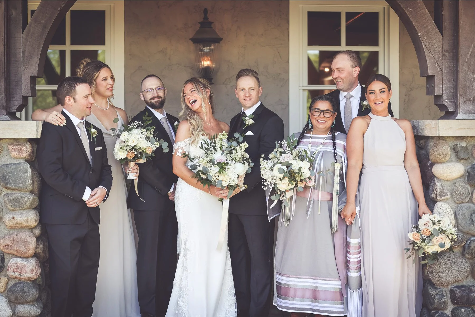 Eleanor had a few highlights that she wanted to visit on the property so it felt like we were doing a greatest hits tour and I absolutely loved it! We visited my favorite spot next to the creek so they could dip their toes in and enjoy the cool water. Then we decided to take the long way back and enjoyed the field and tall grasses. It felt like we had the entire place to ourselves and it was the perfect way for them to enjoy their newlywed bliss. We made our way back to the reception where the party was ready and excited to welcome the couple with cheers and hollers from the crowd. After a few touching toasts, Andrew received a truly remarkable surprise. The Minnesota Hockey Hall of Fame was honoring his work with veterans and was adding his jersey to their collection highlighting his non-profit. He was thrilled and honored, but no one was more proud than lovely Eleanor sitting by his side. We ended the night by stepping away from the party to watch from the large picture window. The music from the dance floor could be heard faintly and they smiled as they watched their loved ones enjoy the party as the colored lights lit up the night sky. Then one last kiss by the signature fountain and the night was complete.