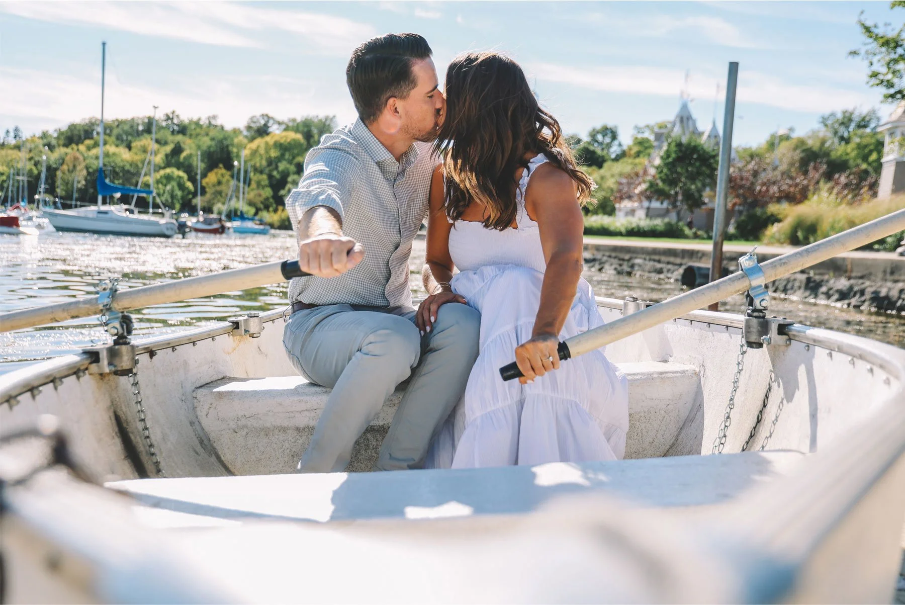 I joined Jennifer and Bryan in the Linden Hills neighborhood for their fun and summery Local Adventure engagement session. They were in the middle of planning a wedding in Georgia, so for their engagement session they wanted to show off their favorite parts of Minnesota. We grabbed a bottle of champagne and headed for the lake! It was great to be by the water on this warm day where the blue sky seemed to go on forever. They laughed and toasted to their upcoming “I do’s” and we all enjoyed the perfect session watching the boats go by.