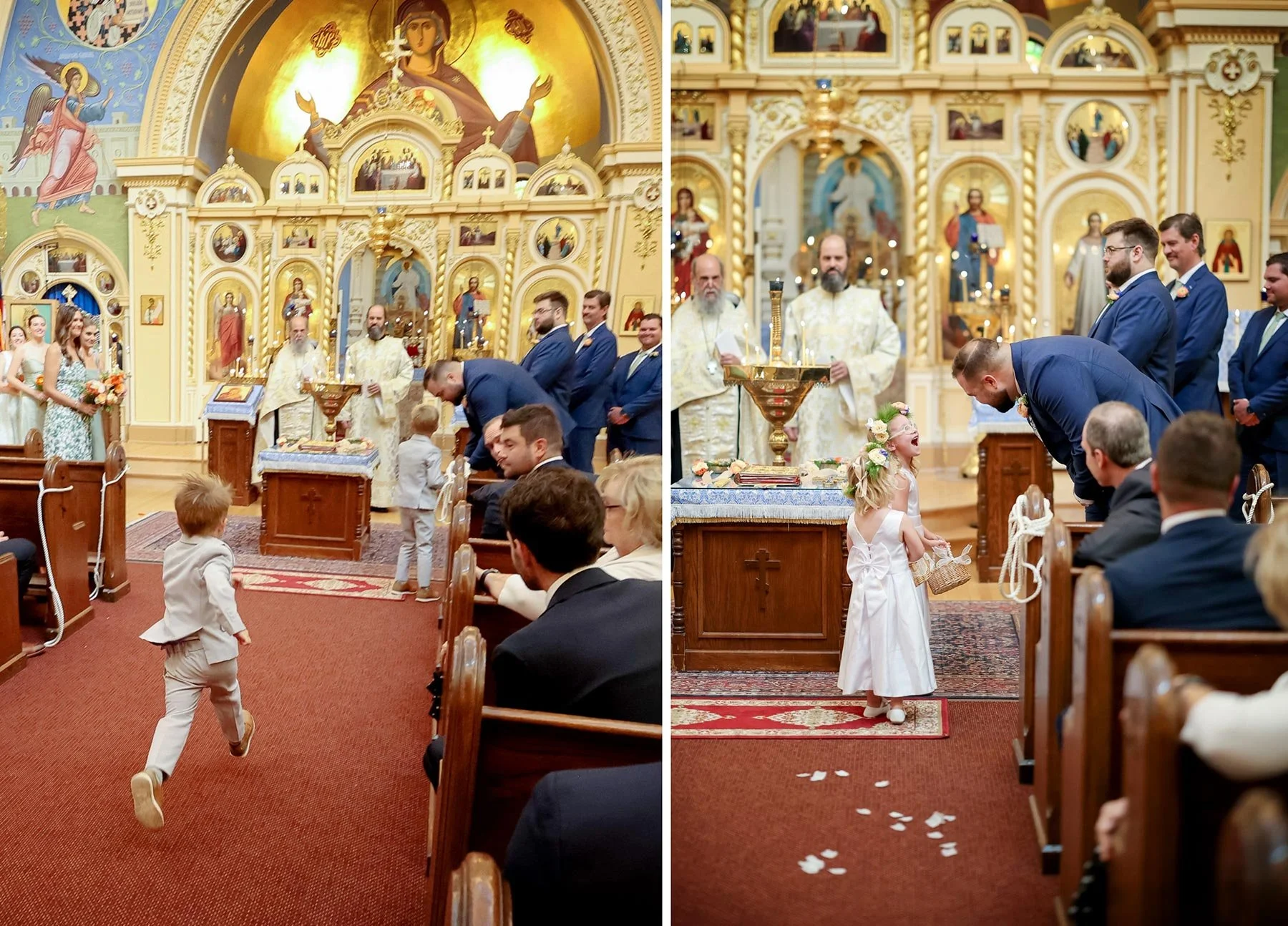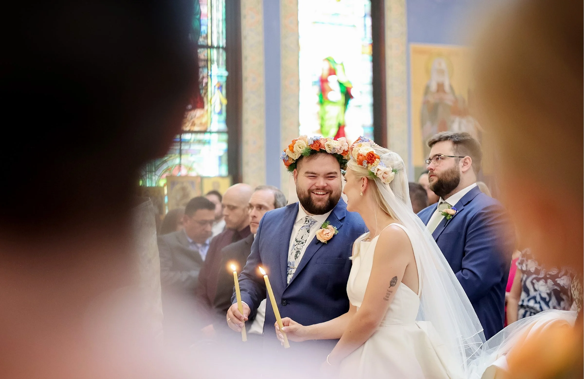From the club, everyone made their way to St. Mary’s Orthodox Cathedral for the ceremony. The moment you step inside that space, you’re surrounded by stunning architecture and centuries of tradition. The ceremony itself was beautiful and deeply meaningful, filled with Orthodox customs that have been passed down for generations. Julia and Samuel wore flower crowns during the crowning portion of the ceremony, and the candle lighting and ceremonial laps around the gospel created such a powerful sense of history and symbolism. Watching them take those steps together as husband and wife was incredibly moving.