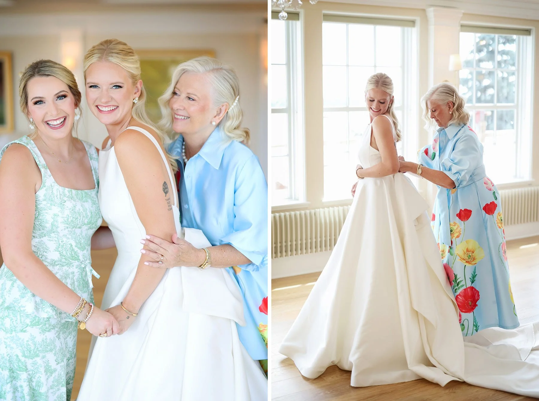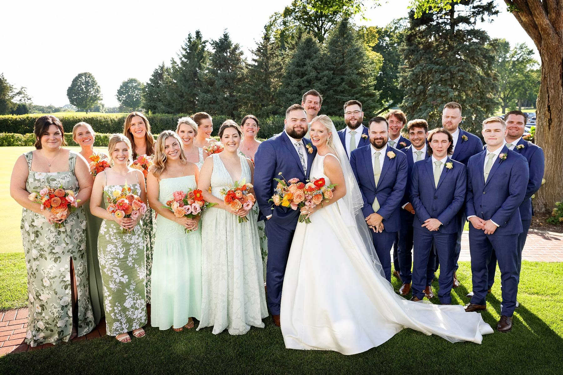 The next morning began at The Minikahda Club, where Julia got ready surrounded by her bridesmaids in matching pajamas and a room full of joy. Julia’s dress reveal to her bridesmaids was just as sweet, filled with gasps, smiles, and hugs. The bridesmaids wore dresses all within the same family of greens, each one slightly different, which gave the group a beautiful, natural look. Bright orange flowers added a bold pop of color throughout the day and tied everything together perfectly.