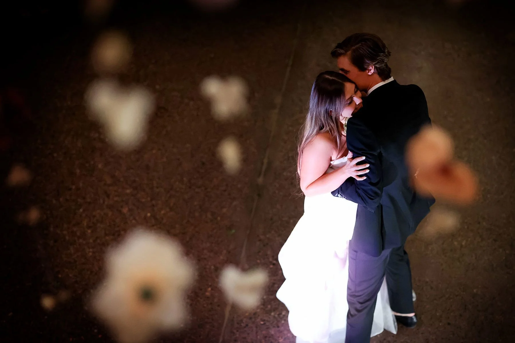 The big moment was finally here, so we made our way to Quincy Hall where the ceremony space had been beautifully decorated. Their intentionality and attention to detail could be seen in the stunning cascading flower backdrop that gave a whimsical and bright mood to the space. The entire crowd stood in awe as Natalie walked down the aisle toward a breathless Garrett who was all smiles. They shared thoughtful and sweet vows with each other as everyone smiled along with them, some even dabbing happy tears from the corners of their eyes. A stunning flower installation hung from the ceiling and perfectly framed the happy couple as they shared a kiss and danced down the aisle where they were greeted by their sweet pup who had been waiting patiently for a moment to shine.