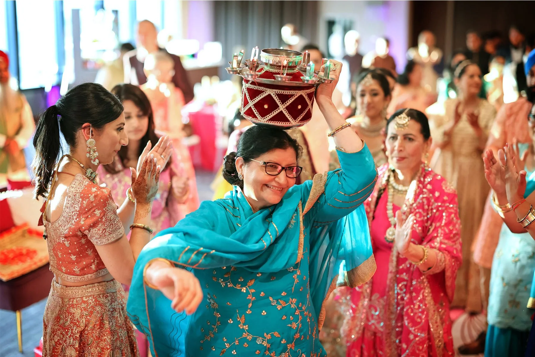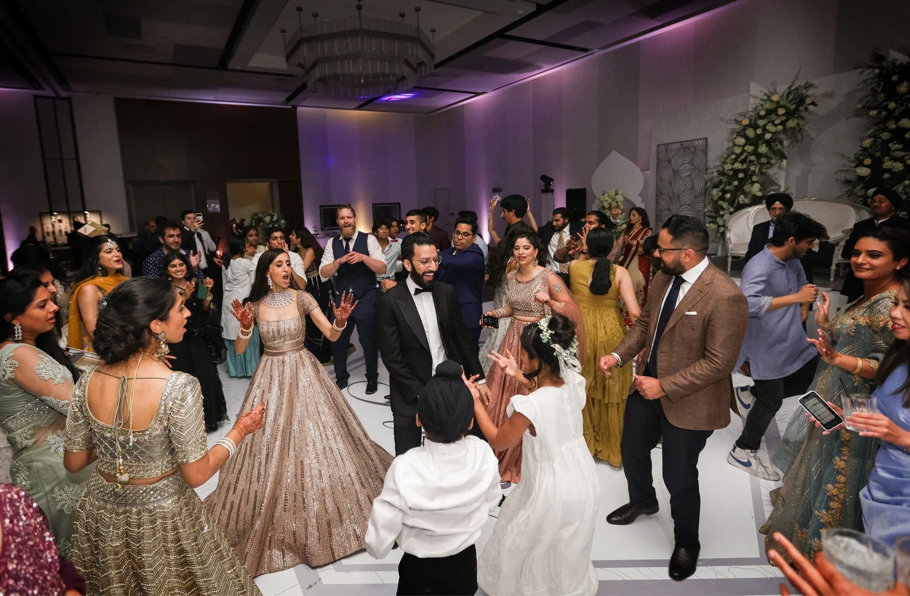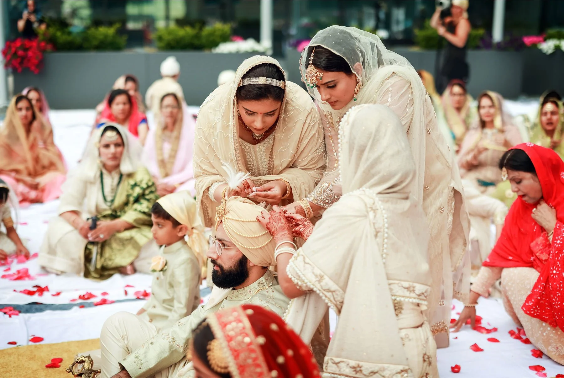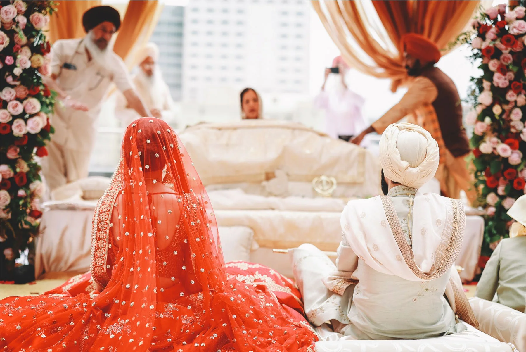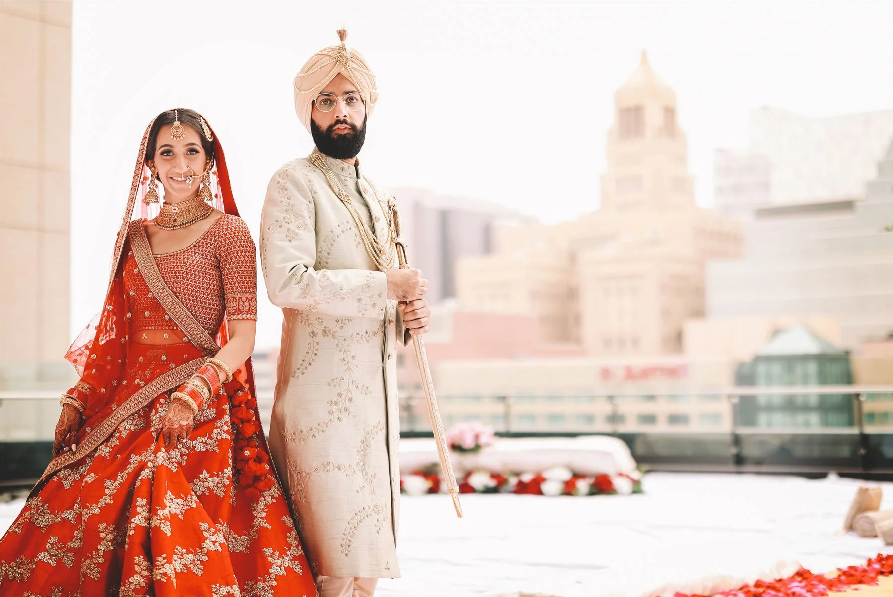 The next day was the biggest celebration of them all so we started early. I joined Parm while she was putting on the finishing touches with the help of her family. She wore a beautiful red dress and the henna on her hands from the mehndi ceremony was flawless. Prince got ready in another room and then made his way downstairs where their loved ones and guests were waiting. He sat atop a beautiful white horse and was accompanied by a small foal as everyone danced and sang alongside. The parade made its way to the front entrance of The Hilton where Parmpreet was waiting with a big smile. I went up to the rooftop with the couple to take in the amazing view of downtown. We took in a few quiet moments before the part moved upstairs and in this moment I couldn’t help but be overwhelmed by the amazing hospitality and love I was shown by everyone here today. From the couple, to their family and friends, and the vendors, I felt like this was not only the party of the summer, but it was the party everyone wanted to attend because it was just so incredibly warm and welcoming.