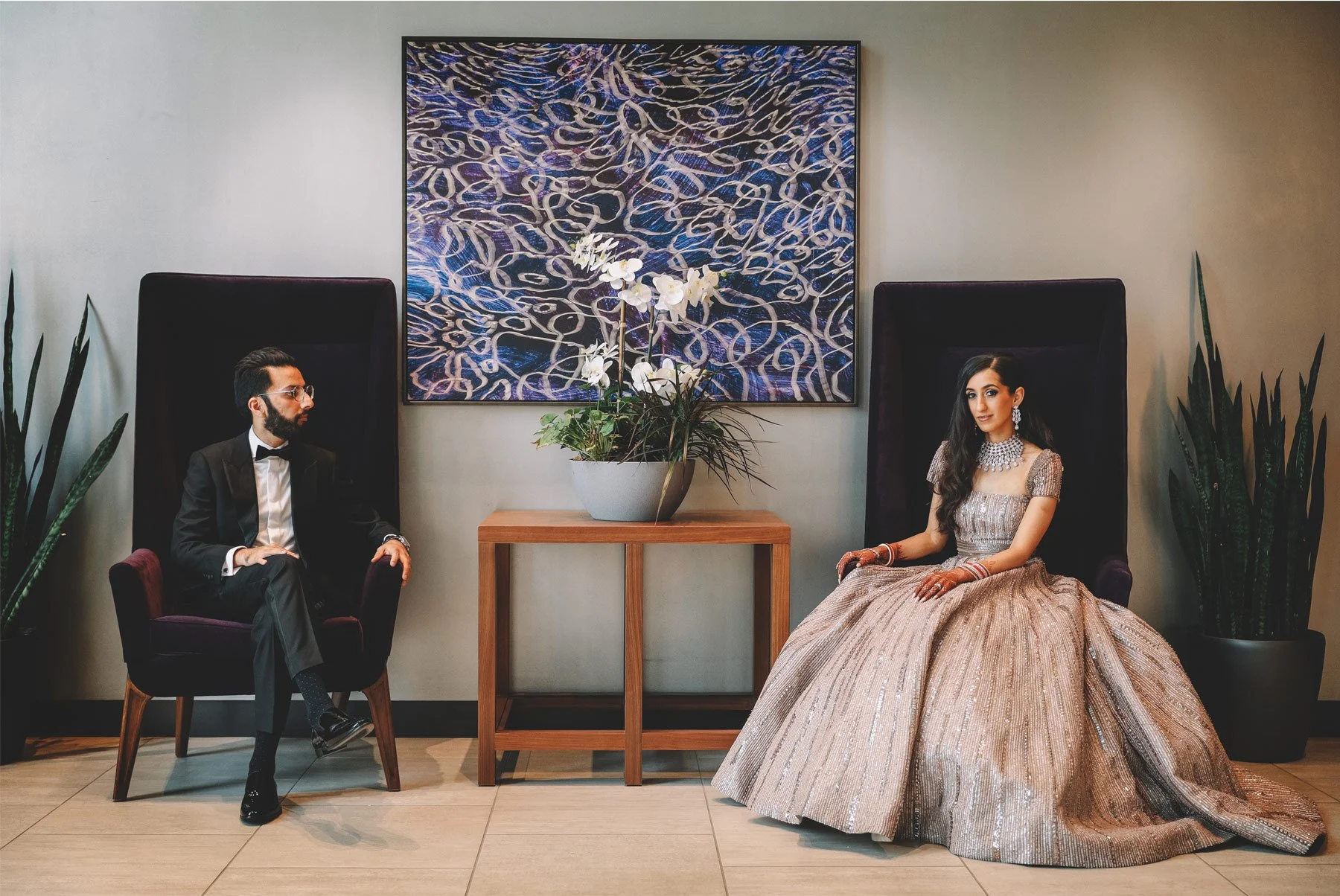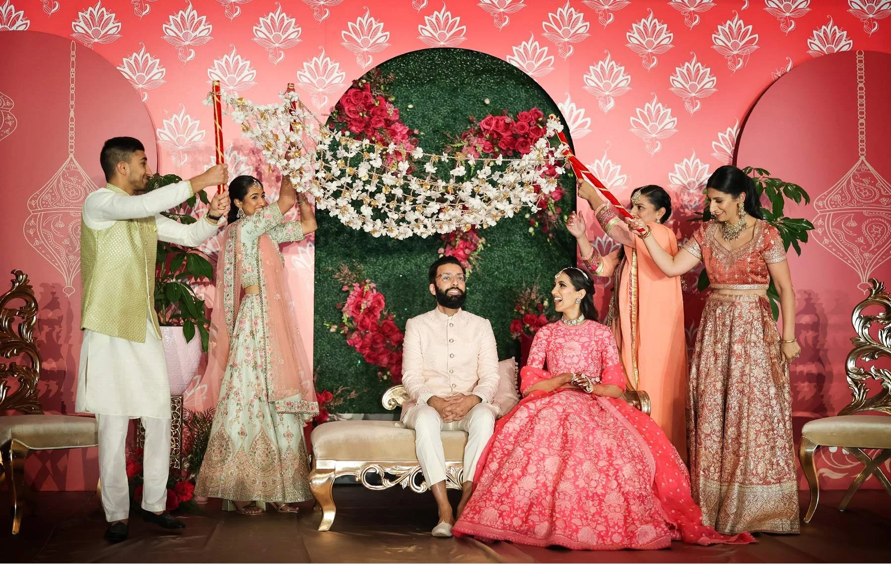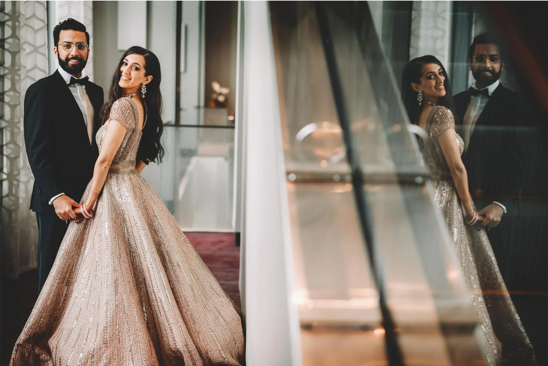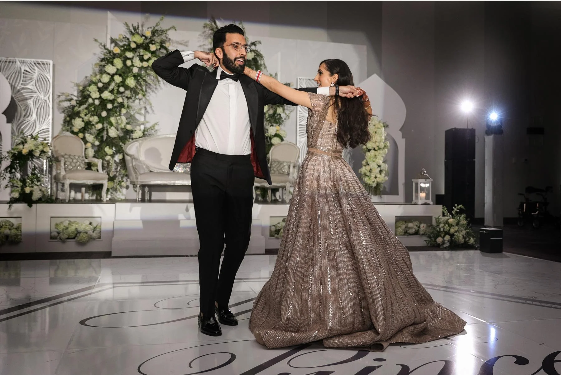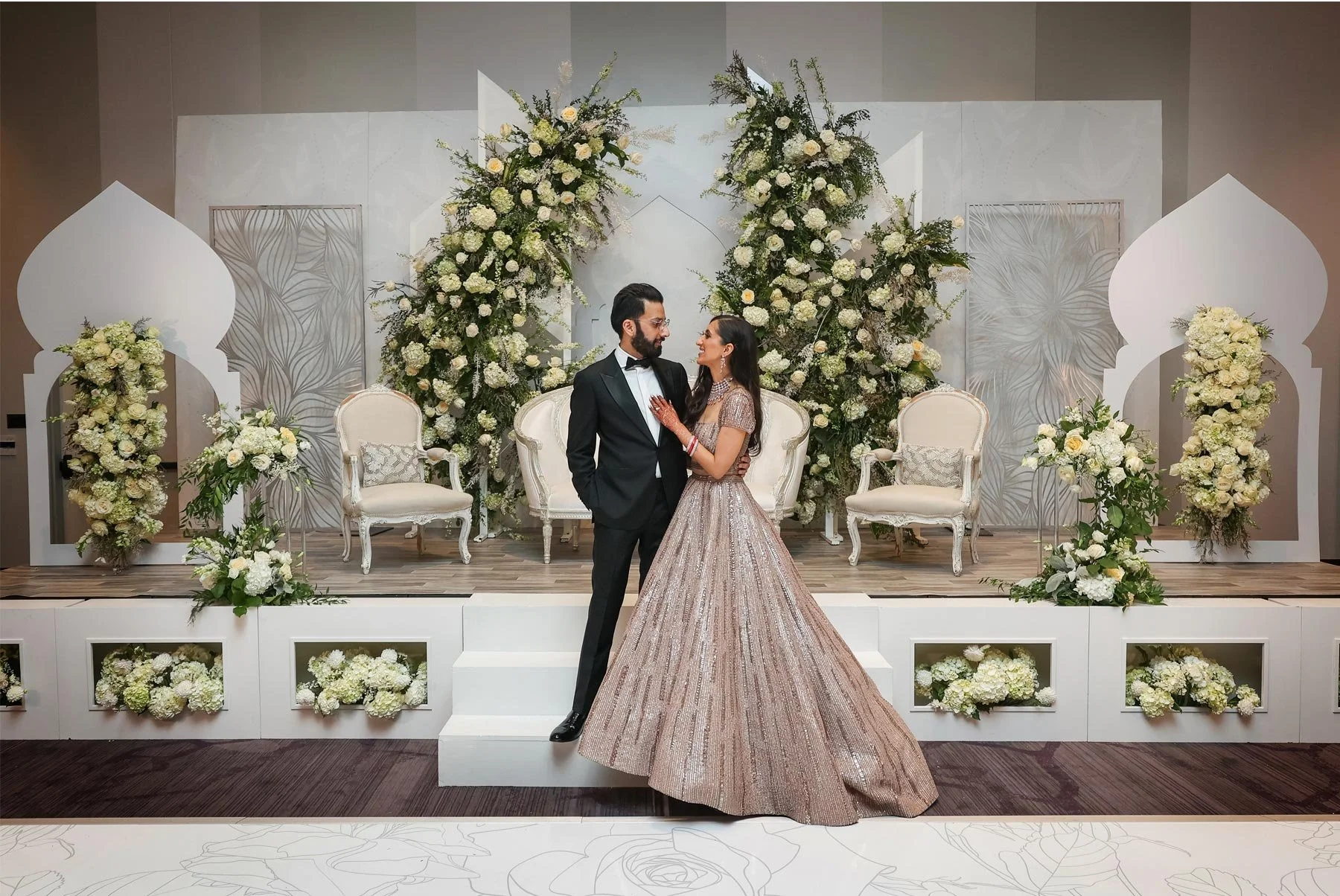 Vendors: Hilton Rochester (venue and catering), Hana April Inc. (creative design agency), Om Prakash (catering), Alma Films (videographer), Sabyasachi (dress designer), Valentino (shoe designer), Suit Supply (suit), Primped (hair and makeup)