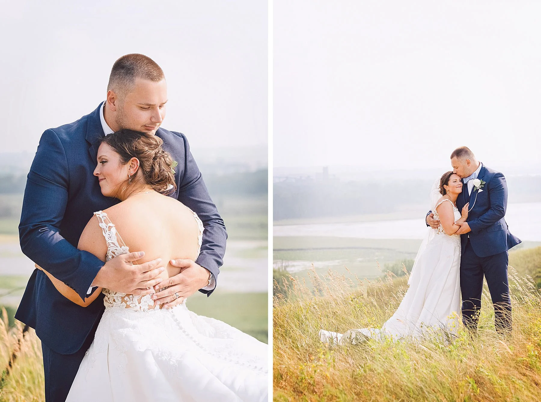 Shannon looked gorgeous as she walked down the aisle toward Jake who was standing proudly at the front of the church. You could almost feel the family history and all the other love stories shared within those walls as they too exchanged their vows. Everyone cheered as they kissed and walked down the aisle toward their future together. Instead of heading right to the reception, the wedding party boarded a party bus and took the scenic route. Everyone sang along at the top of their lungs and knew every word to every song. Erin felt like she was part of a mini karaoke party in the best possible way. They stopped at a gorgeous overlook and everyone stepped out for some fresh air and to take in the scenery. Shannons dress blew in the wind as Jake lovingly looked on.