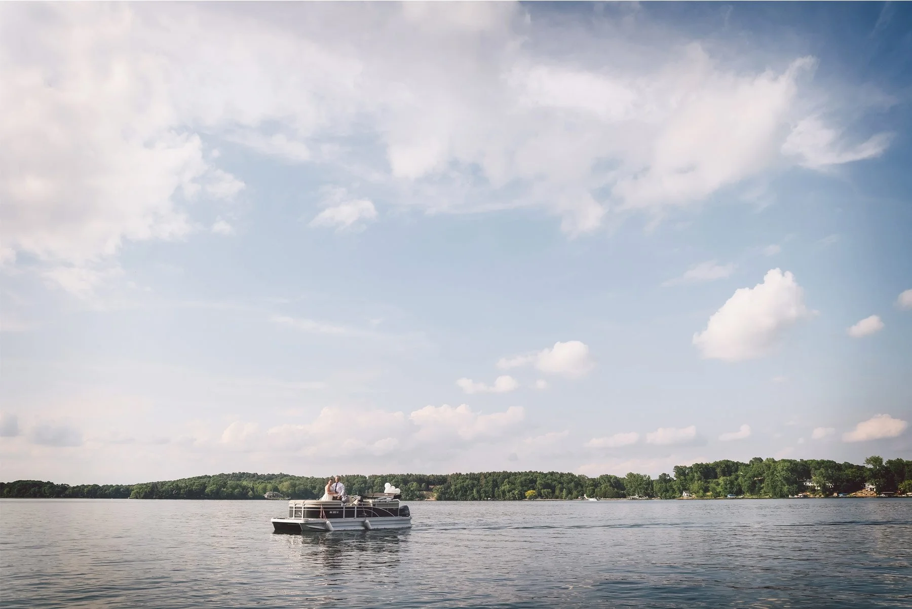 Once everything was in its place, the beautiful outdoor ceremony was ready to begin. Family watched from the deck overlooking the lawn as Vanessa walked down the aisle and stunned everyone in her gorgeous unique veil and beaming smile. Anthony couldn’t take his eyes off her. The joy-filled ceremony was complimented by a cool breeze off the lake and lots of giggles and smiles. When they were finally declared husband and wife, we decided to jump on a pontoon and take a victory lap around the lake. Onlookers cheered from the shore and Vanessa stood on the seats to let her veil flare out, turning her into a bridal superhero. Watching them laugh and gaze out over the water taking in the moment was the perfect way to lead into the big party that awaited them on the shore.